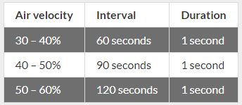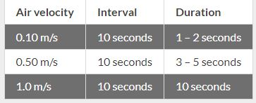 The interval between fogging pulses is set at 10 seconds. The duration of fogging depends on the air velocity created by the ventilation system.