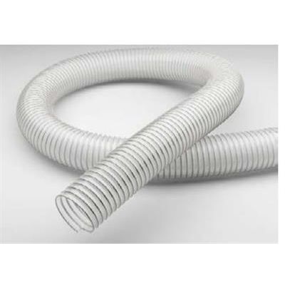 Food quality, Polyether Polyurethane, PU, flexible hose and flexible ducting, reinforced with embedded stainless steel wire helix. PU wall thickness 0.7mm. This FDA approved Food Grade Hose, which is extremely lightweight and highly abrasion resistant, is great for food applications: Polyether polyurethane hose, Reinforced with embedded stainless steel wire helix, PU thickness = 0.7mm.