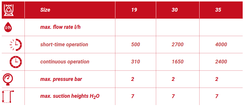 Advantages: Self-priming up to 7 m H2O. Safe to run dry. Excellent solids handling. I.e. Ideal for abrasive. Media. Gentle pumping of sensitive media. No seals and valves. Pumping of viscous media. Ideal for aggressive media.