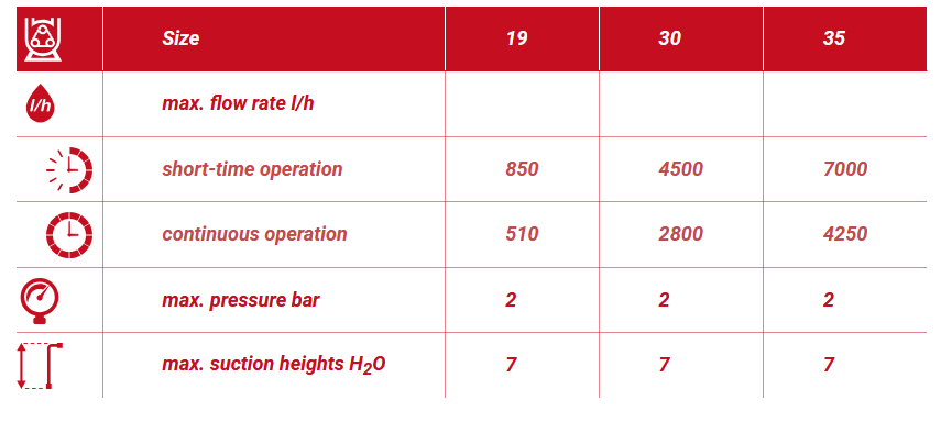 Advantages: Self-priming up to 7 m H2O, safe to run dry, excellent solids handling, i.e. ideal for abrasive media, gentle pumping of sensitive media, no seals and valves, pumping of viscous media, ideal for aggressive media.