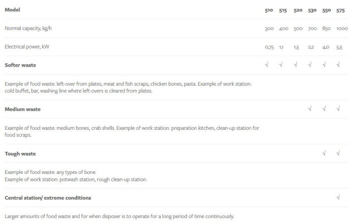 The choice of disposer size is determined based upon type and the volume of food waste or number of persons per meal. A higher motor power and larger grinding unit allows for, besides increased grinding power, also increased pumping and transport capacity of the grounded food waste through the water trap and into draining pipe. A larger model should be chosen if the disposer is expected to run for long periods without stopping, e.g. for continuous operation during 1-2 hours when removing food waste from plates.