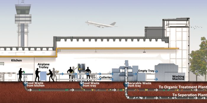 Food waste can be disposed into inlets or load stations and transported through the pneumatic infrastructure pipeline to a collection station or directly to a food waste treatment plant. From the collection station, the container can be hauled away to a treatment plant where the waste can be converted into gas for energy. This solution paves the way not only for the most environmentally sustainable mechanism for food waste but for the management of the remaining recyclable waste as well.