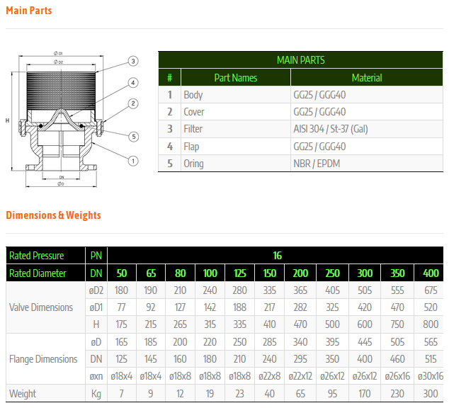 TYPHOON Foot Valves are valves that are mounted on the suction line of the suction pumps and prevent the return of the water in the system, as a result of the combination of the filter and the clapper. Thanks to the glob design, the pressure loss goes down to a minimum and the water continues to flow without deterioration. The filter in the valve prevents particle entering the system and ensures that the water transferred to the pump is clean. It prevents the pump from becoming dehydrated when it is started. The flap in the body prevents backflow to the pipeline and discharge to the pipeline. Rated Pressure: PN10 – PN16