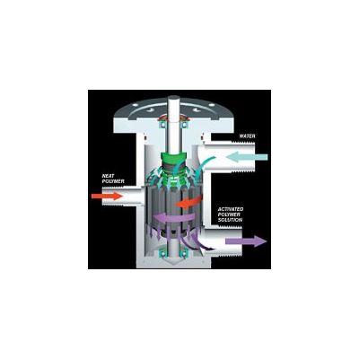 introduction of polymer to water followed by gentle, low shear mixing in a multi-stage static mixer. The rotating, slotted head operates at close tolerance to the inner wall of the mixing chamber. The clearance does not permit fish-eyes or gels to form. The slotted rotor creates a series of high velocity vortexes without the use of turbine blades which can damage fragile polymer chains.