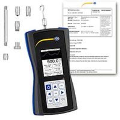 PCE-DFG N 500 Digital force gauge for tensile force measurement and pressure force measurement up to 500 N / Very high accuracy / Sampling rate 1600 Hz / 6 different measuring tips / USB interface / Software / Calibration certificate. A digital force gauge for tensile and compressive force measurements up to 500 N is available with the PCE-DFG N 500. The PCE-DFG N 500 is a digital force meter for precise measurements with a resolution of 0.1 N. The measured values are displayed on a large, illuminated, 180° rotatable display, a correct reading of the measured values is thus guaranteed at all times. The outstanding accuracy of ± 0.1% FS is confirmed with the factory calibration certificate provided. In addition to the internal storage option of 100 measured values, a USB interface is available for data transmission. With the software, the measured values can be saved on a computer for later evaluation.