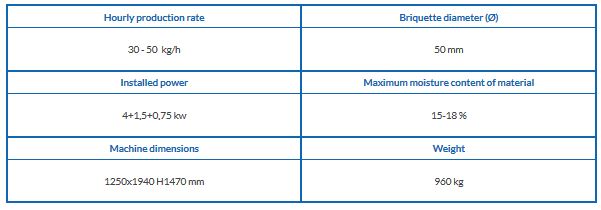 The FORCE 50-50 briquetting press consists of a single element on which a mini silo, expulsion mechanics and hydraulic control unit are mounted. This solution offers many advantages due to the limited amount of space it occupies. The machine has been designed for customers who do not need to process a large amount of material but who nevertheless demand a high qu ality briquette for either commercial purposes or their own personal use. A wide range of accessories is also available to customize the machine to every client’s individual needs.