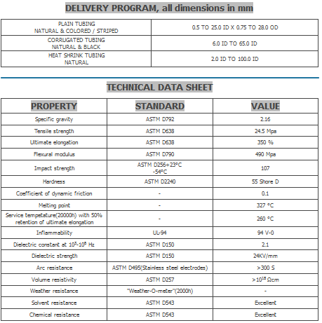 Excellent resistance to chemical corrosion. High breakdown voltage / dielectric strength. Biosafe and inert. Extremely low water and gas absorption. Low static and dynamic friction coefficient. Highly non stick for smooth passage of fluids. High temperature resistance.