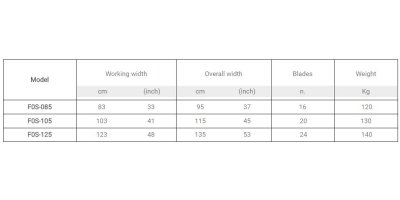 Universal 3 point linkage Cat. 2. Swinging and self levelling 3 point linkage. Gearbox 540 rpm PTO. Transmission driven by toothed belts. Rotor with hammers. Counterblade mounted on inner frame. Adjustable self-cleaning rear roller. Hydraulic side shift with security hydraulic valve. Hydraulic inclination with connecting rod. Self-lubricant bushings on joints. Stand feet. Transmission cover protection. Front protection flaps. Standard cardan shaft with tractor linkage 1"3/8 Z=6.