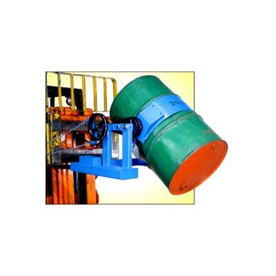 Morse`s lift truck attachments are used to move and pour your drum weighing up to 800 Lb. Convert your lift truck into a drum handler. Turn drum 360 degrees, in either direction. You control the drum tilt with 30:1 ratio tilt gears. This attachment requires 25" between forks, as fork pocket openings are 25" apart. Each opening is 2.5" high by 6.5" wide. The pull chain loop allows drum tilt control from the driver`s seat of your fork truck with 20` chain loop providing a 10` drop of chain for operator to turn drum.