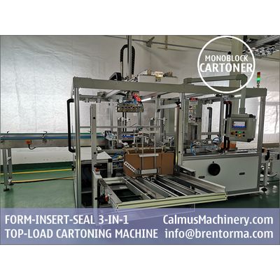 Form-insert-seal 3-in-1 case packer for packaging bricks. This top-load case packer is a monoblock cartoning machine with corrugated cases/cartons forming, filling and sealing functions. It employs a picker for picking and inserting brick-shaped products in multiple layers into cases from their tops.