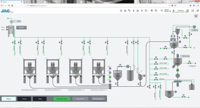 The visualization JAG PVI+ is a web-based module of the JAG MES framework for operation and monitoring. Already existing PCs, touch panels and pads can be used to operate and monitor a system. An installed and updated web browser is sufficient. A process plant can be represented in the form of an animated P&I diagram. Historical data can be easily accessed (with JAG Historian as data source). User dialogs for manual intervention by plant operators are also part of process visualization.
