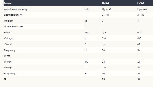 The speed of the rotating hard disk (2800 rpm / min), together with the numerous sharp edges, produces mist (up to 40l/h) with 180W of electric power. The degree of protection (IP56) and the thermistor make this machine extremely reliable and safe. The materials used (ABS, polycarbonate, and polyamide) ensure the long-lasting life of the UCP over time.