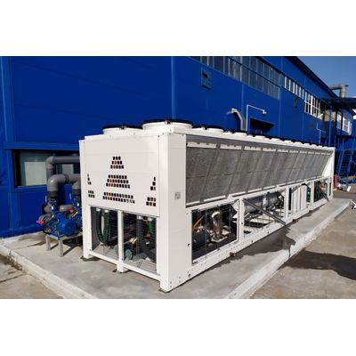 Everything in this unit is design for high efficiency: two screw compressors (one per circuit) with three partialization steps each, EC fans to better control the condensing temperature, optimized condenser coils to lower the condensing temperature and free-cooling coils to take advantage of the low temperatures in Russia. In addition the protection grid avoid stranger’s sabotage while filters protecting condenser avoid its fouling and preserve its chemical and mechanical properties. The chiller is shipped with reinforcement bars on the frame to avoid its deformation while loading it in containers/trucks.