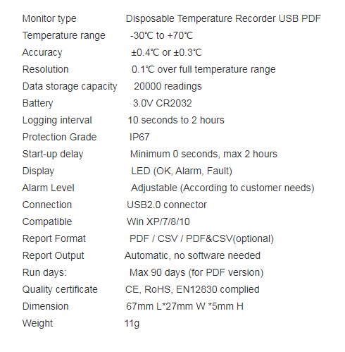 Freshliance Thermis Log Disposable Temperature Recorder USB PDF for Pharmaceuticals and Covid-19 Vaccine, with +/- 0.3? accuracy, and is ideal for monitoring and recording the temperature-sensitive goods during transportation, especially vaccines. Freshliance Thermis Log Disposable Temperature Recorder USB PDF is perfect for pharmaceuticals, food, life science, cooler boxes, medical cabinets, fresh food cabinets, freezer, laboratories, vaccines and protein products etc. It is with very cost-effective design and simple to operate, smart size to minimize the space occupation. The monitor data can be directly read via PDF format by PC at destination.