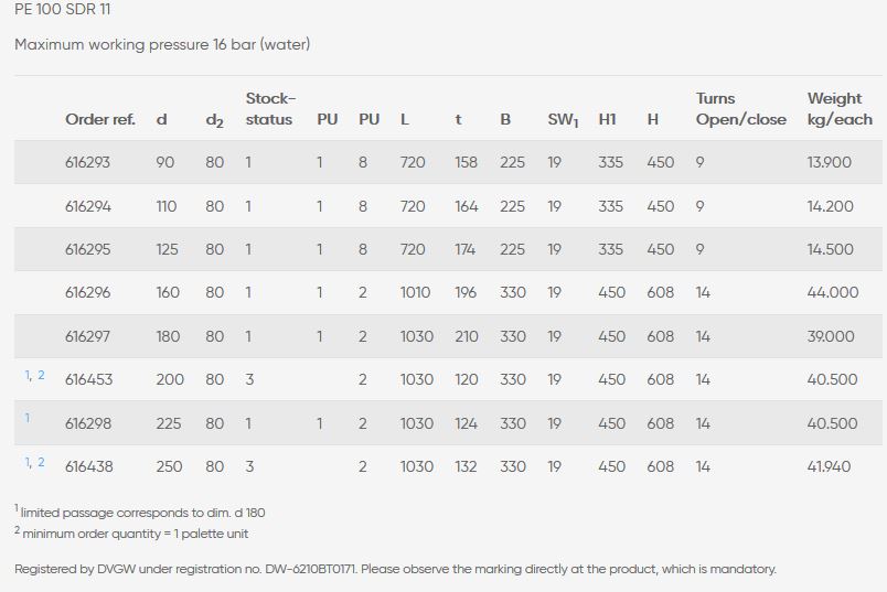 constrictions with regard to the connecting pipe SDR 11. Actuation is made from the street cap using the installation kit FBS. Thanks to the innovative shut-off mechanism, activation is possible with only a few turns and without major force. For further information see this data sheet page 2 or data sheet installation kit FBS No. 63/07.