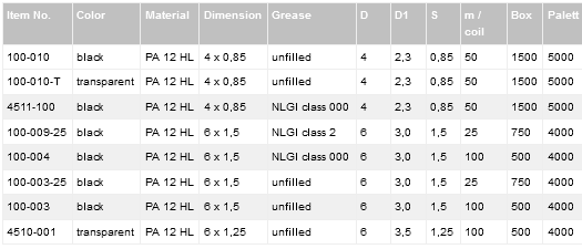 - PA 12 PHL , natural-coloured or transparent with black print; either unfilled or filled with NLGI viscous oil, class 000.