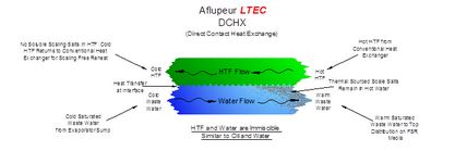 - The warm HTF transfers heat into the cool brine through direct, immiscible liquid to liquid contact; the brine warms and the HTF cools. no solid heat transfer surfaces to scale