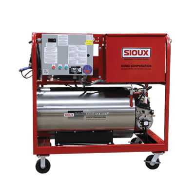 Sioux's conventional hot water pressure washers are equipped with an electric motor driven pump and fuel fired natural gas, oil (diesel), or propane burner. Models range from 750 to 3,000 PSI (52 - 207 BAR) and 2.5 to 5 GPM (9.5 - 18.9 LPM). All Dakota II pressure washers also provide up to 320°F (160°C) at 250 PSI (17.2 BAR) steam cleaning capability. You get three different functions with the Dakota II: hot pressure washing, propane fired hot water steam cleaning, and cold pressure rinses in one rugged, compact unit.
