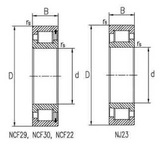 Single row, NCF..V type (V full complement of rolling elements, without cage).