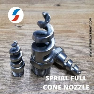Full Cone nozzles use a specially shaped vane placed at the nozzle inlet to give a rotational twist to the fluid flowing through the nozzle. Because of the rotational speed twisting of the fluid, water exiting the nozzle orifice is subjected to centrifugal force and opens up in the shape of a Full Cone. The extent of the angle of the cone is a function of both exit speed (created from the inlet pressure) and the internal design of the nozzle. continuous liquid curtain evolving with the shape of a spiral inside a conical volume. The disadvantage of a scarcely even distribution is compensated by an exceptionally good resistance to clogging, large orifice and vaneless which make this nozzle the best choice in those applications such as wet scrubber, fire-fighting systems, etc. It can vary in practice from 15° to 120°.
