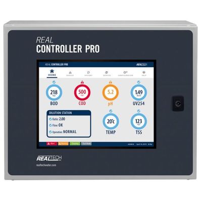 Full control and monitoring of multiple sensors can be achieved with the plug and play Real Controller Pro. Featuring a 12.1” colour LCD touch screen graphic interface, the controller offers superior functionality and configurability while maintaining ease of use and navigation. The controller provides proprietary inputs for multiple Real Tech sensors and accessories bringing all water quality data to a single location – making analysis quick and simple. Modbus TCP is standard with optional Modbus RTU (RS485), 4-20 mA input, 4-20 mA output, Digital I/O dry contacts and cell modem.