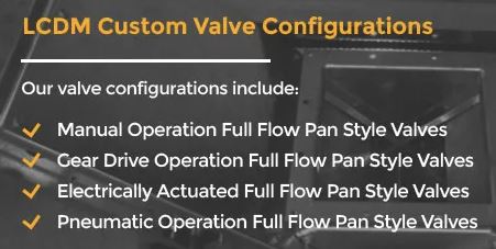 Manual operated valves are the most common option. Stock sizes range from 6” to 16” with both 10 gauge and 8 gauge galvanized metal body options. The inlets and outlets of these valves are square, but can be made round by adding square to round transitions. LCDM stocks 45° valves but 60° valves are available upon request.