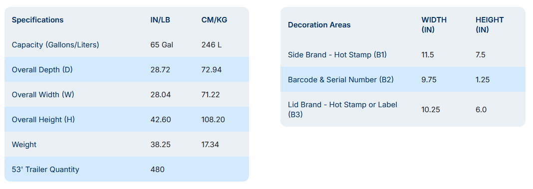 - “Ready to Roll” Design – lids, locks, catch bars, and body are fully assembled on delivery; Onepiece blow molded snap on (BMSO) wheels with integrated spacers takes only seconds to attach for deployment