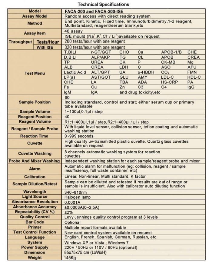 This automatic biochemistry analyzer comes with varying testing capabilities that conducts 200 tests per hour with true random access and 10 filters: 340nm, 405nm, 450nm, 492nm, 505nm, 546nm, 578nm, 620nm, 670nm, 700nm Additional filters can be added.