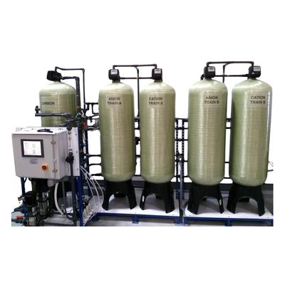 This system is designed for fully automatic operation using air operated control valves for higher flow and enhanced operation control. It is a dual train IX system including a back-washable carbon pre-filtration stage. All operations are controlled from the Touch-Screen control panel including fully-automatic regeneration sequencing controls.