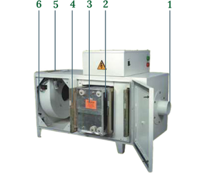 Particles in fumes, smoke or dust stream enter the electrostatic filter through the suction inlet (1) Particles carried by the air stream first enter the pre- filter (2) where large particles are removed. The finer particles then enter the electrostatic module (3) where, between a series of parallel aluminium plates, they receive a high +ve charge. These positively charged particles then pass through another series of aluminium plates which are negatively charged. Here, the particles are attracted to the oppositely charged aluminium plates and stick to them just like iron filings are attracted to a magnet, but, with one difference, the particles remain adhered to the plates even when the electrostatic filter is switched off. The air, now devoid of particles, escapes through the outlet (5) of the system as clean air. The post filter (4) evenly distributes the air flow through the electrostatic modules. Post filters when fitted with activated carbon granules can control odour & smell. Suction is provided with a centrifugal fan (6).