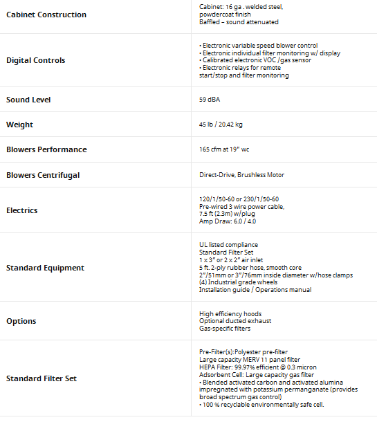 The FA1 Mini industrial air purification system for indoor use, utilizes a quiet, high performance blower and a 4 stage hybrid air filter system to capture and treat dust and gases generated in many industrial & woodworking processes. Two large capacity pre-filters protect the system’s HEPA filter and gas/odor filters providing a cost-effective, industrial air purifier system. Ideal for a variety of light duty indoor applications.