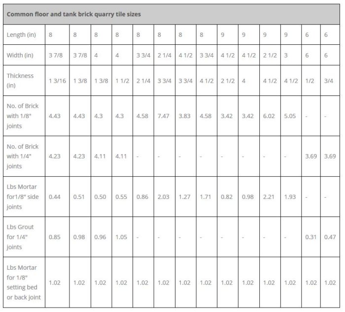 The above quantity requirements are based upon physical dimensions of chemical-resistant masonry units and actual weight of mortar as determined by ASTM C-905. Actual usage rate will vary dependent upon scope of installation, experience of workmen, field conditions and other contingencies. Personnel using the above chart should, therefore, add an appropriate wastage factor.