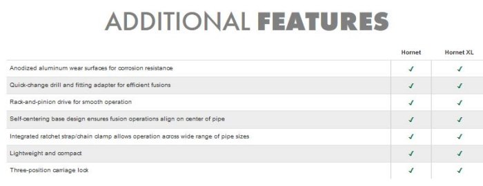 With a small footprint and weighing just 11 pounds, the Hornet is capable of performing outlet fusions in any orientation — making it ideal for overhead and vertical fusions in tight spaces. The Hornet XL also fuses in any orientation and requires only a single operator.