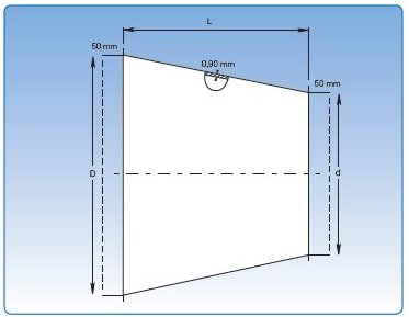 Tapers are spot welded and made of 0.90 mm galvanised sheet metal. When assembling with wide pull rings [f.bb], rapid lock pull rings [f.lyn] and loose flanges [f.b.m.fl] length (L) is increased by 2 x 50 mm. State D- and d dimensions when ordering. Length L is stated in the table below. The difference between the larger and smaller diameter (D - d) is plotted on the vertical axis of the coordinate system. By following the line from this point to the intersection, the length (L) can be read at the corresponding point on the horizontal axis.