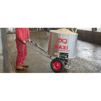 Battery operated wheeled sawdust dispenser. The AG Maxi sawdust dispenser is designed to discharge many types of sawdust at high speed with a capacity of 2-3 25kg bags. The Maxi is ideal for spreading sawdust on cubicles and also spreading other disinfectant materials.