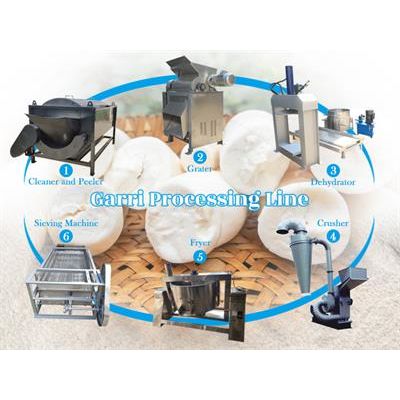 The garri production line is composed of a series of cassava processing machines, such as cassava washing and peeling machine, cassava grinding machine, cassava mash dewatering machine, gari frying machine, garri screening machine and packing machine and so on. The whole set of machines are made of stainless steel so that they can ensure high-quality cassava flour.