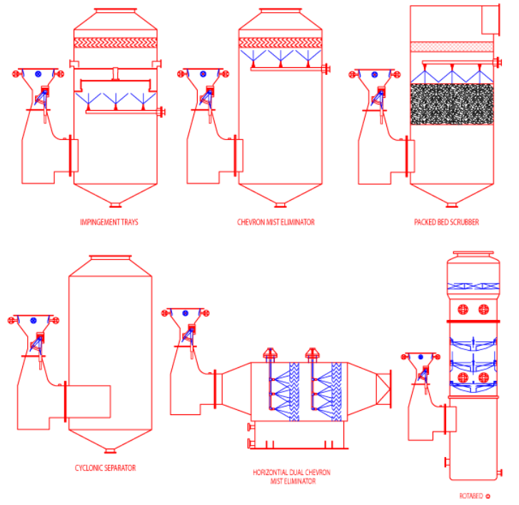When further gas treatment for odor control, gas sub-cooling or absorption is needed, entrainment separators can be fitted with a packed bed stage, tray or patented RotaBed® components to meet the performance requirements. For forced draft high temperature gas applications, separators can include integrally mounted stacks complete with service platforms, access ladders and analytical gas sampling instrumentation.