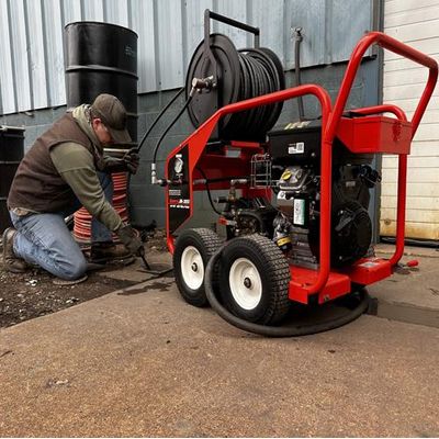 The JM-3055 has the power to clear your most stubborn stoppages, including grease, sand and ice. Its 3000 psi, 5.5 gpm triplex pump has the thrust to pull the hose down long runs, the pressure to cut through tough stoppages, and the flow to flush them away. In fact, the JM-3055 has the highest flow rate available without requiring a holding tank. It’s driven by a 480 cc Briggs and Stratton Vanguard engine with electric start. The pump features Vibra-pulse® on demand to help the hose slide around tight bends and down long runs. The JM-3055 is well balanced so that with little effort, the machine can be tipped back on its rear wheels to more easily maneuver it into position. A removable 300 ft. capacity hose reel with drag brake, reel lock, and swivel is mounted on a heavy duty frame with four 13” pneumatic tires. A wheel brake keeps the machine solidly positioned on the job.