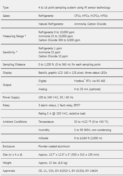 Bacharach`s Multi-Zone gas monitor offers superior performance, flexibility and functionality for low level continuous monitoring of refrigerants, carbon dioxide and ammonia. The 10 inch / 250 mm infrared sensor enables the Multi-Zone to accurately measure lowest ppm levels. A built-in library of over 50 gases and the scalability of the number of zones facilitate customization of the system. The large graphic LCD display and status LEDs provide a system-wide overview at one glimpse.
