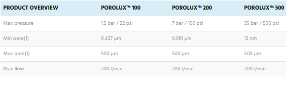 The pressure scan-series contains instruments with pressure levels that go up to 1.5 bar (22 psi), such as the POROLUX™ 100, or go up to 35 bar (500 psi), such as the POROLUX™ 500. The maximum flow rate can be 200 l/min. For details please see the table of specifications for each model.