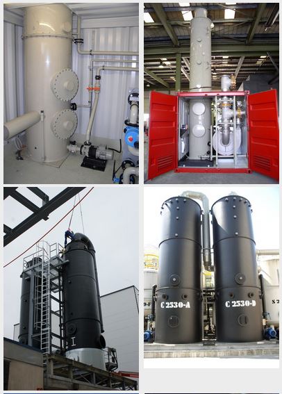 The gas scrubbers are created as cross or countercurrent in horizontal or vertical design. In the packed columns, the exhaust air that needs to be purified is directed through the absorber in countercurrent to the washing medium. The mass exchange takes place in the packing materials zone. The packing materials are made of plastic or metal packages that have a large surface with low pressure drop. After the phase transition, the purified air streams into a droplet separator in which it is separated from the entrained liquid droplets by passing through a droplet separator zone. The washing solution is introduced through a distribution system in countercurrent to the direction of the gas flow. Then the washing solution flows downwards through the gas scrubber. The lower part of the gas scrubber is designed as a washing liquid holding tank. The washing liquid is usually removed from the tank by a pump.