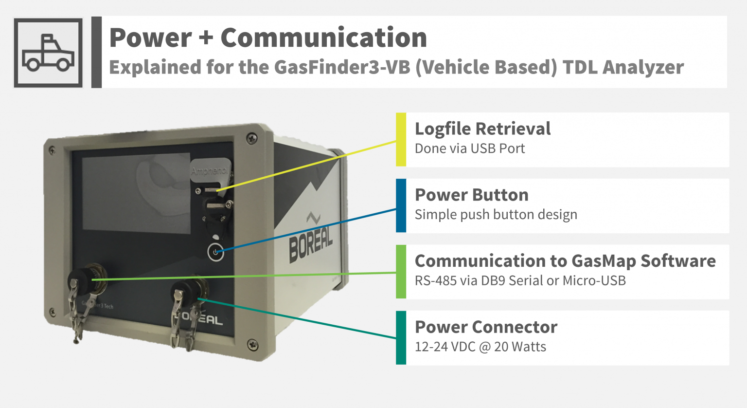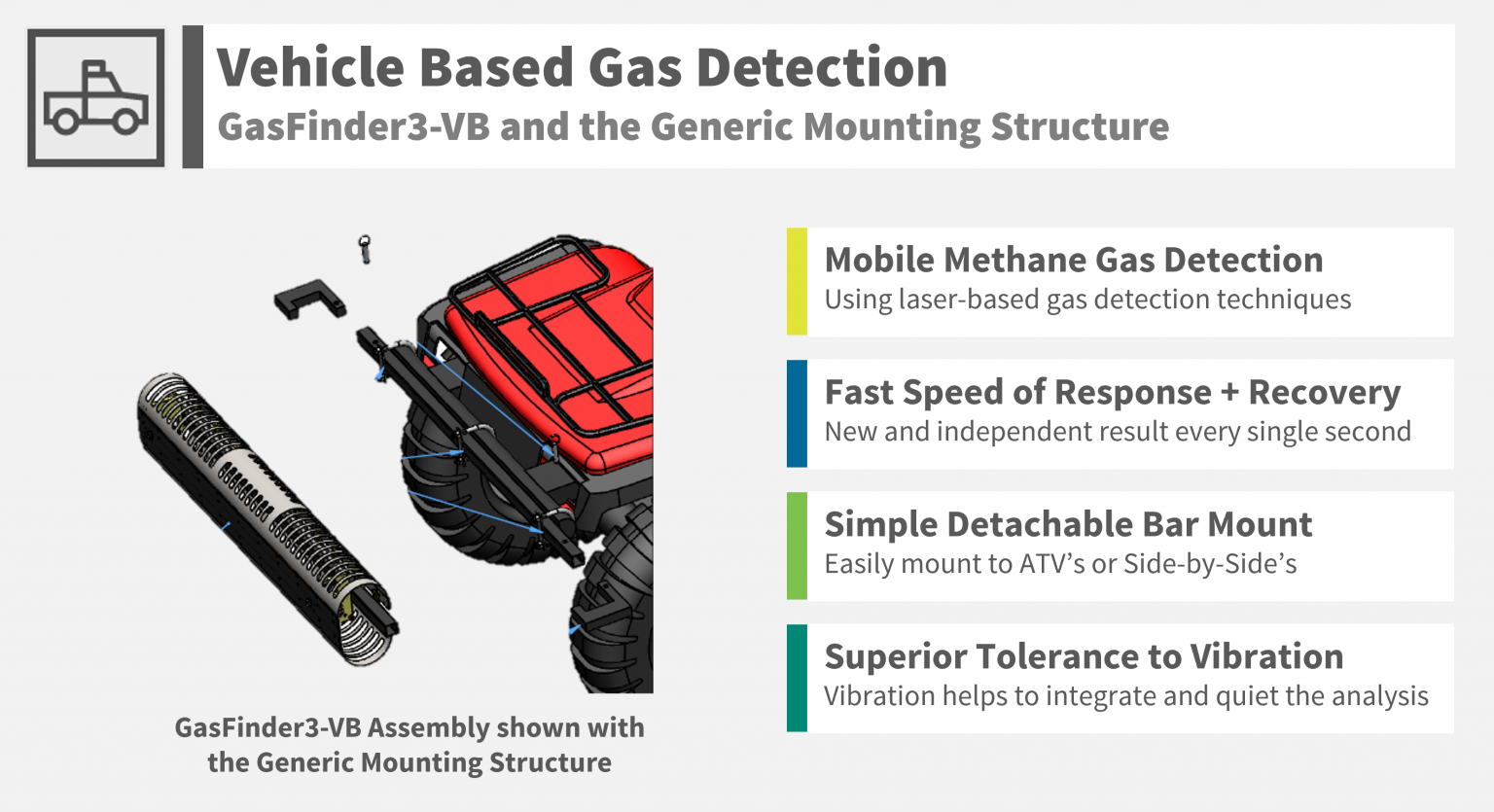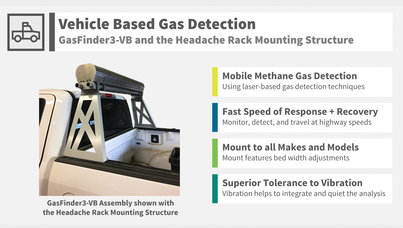 GasFinder3-VB (Vehicle Based) - Mobile Gas Detection System: Using laser-based gas detection technique. Fast Speed of Response + Recovery: New and independent result every single second. Overlay Data on Google Maps: Report the path travelled with concentrations. No Interference + No False Alarms: This only detects the specific target gas of interest. GasFinder3-VB: Can be mounted on just about anything that moves such a trucks, vans, cars, ATV, boats, etc. The GasFinder3-VB includes all of the equipment required to make the mobile based measurements.