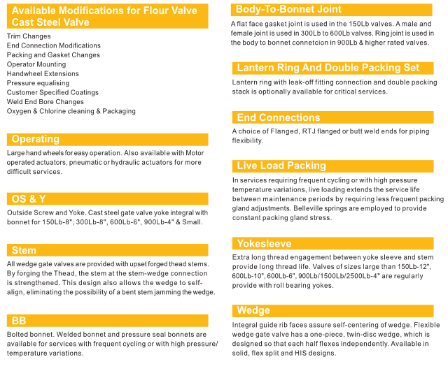 Flour Valve cast steel valves are designed and manufactured to provide maximum service lire and dependability. All gate valves are full ported and meet the design requirements of American Petroleum Institute Standard API 600 & API 6D, British Standard BS 1414 & BS EN 1984 and generally conform to American Society of Mechanical Engineers standard ASME B16.34. Valves are available in a complete range of body/bonnet materials and trims.