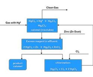 Metallic mercury (Hg0) forms a vapor, which is removed by the Calomel process which is a continuous hydrometallurgical procedure, where the gases are treated with an acidified solution of Hg++ - chloride complexes dissolved in water at temperatures of 25 – 40°C.