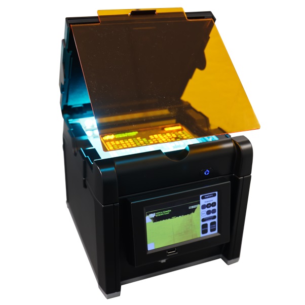 The amber filter shield filters out the Blue/Green LED excitation wavelengths and allows a clear visualization of DNA bands.