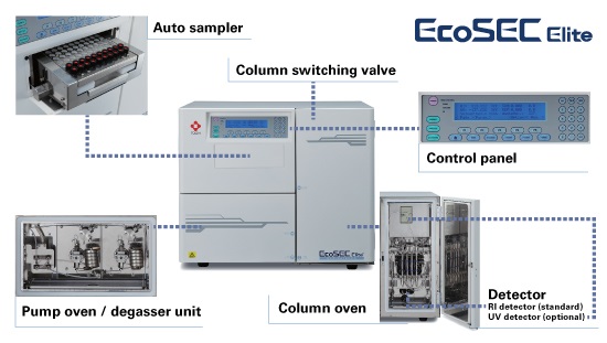The EcoSEC Elite® GPC System is a dedicated GPC instrument developed for fast polymer analysis. The all-in-one design concept delivers these benefits: low dead volume for improved resolution and molar mass distribution accuracy, temperature controlled pumps for excellent flow rate precision regardless of changes in laboratory temperature, dual flow RI (refractive index) detection for unmatched baseline stability. Time and solvent can be saved using the EcoSEC Elite® GPC System with optional semi-micro columns due to the system’s low dead volume. The dead volume of the EcoSEC Elite® GPC System (<20 μL) is less than half the dead volume of conventional GPC systems.