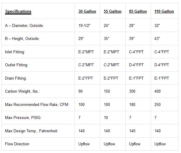Flow Distributors – The 55 gallon barrel uses an air chamber to ensure even distribution of the airflow through the carbon. Low-pressure drop slotted Schedule 40 PVC collectors are used in the 85 gallon and 110 gallon drums for proper flow distribution. Stainless Steel internals and drums are available for special applications.