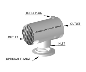 The GC Vent Pure-T is designed to be refillable. Activated carbon has a limited capacity for chemicals and when this capacity is reached the carbon must be replaced. When you notice the smell has returned. the threaded plug on the top is removed and the spent carbon is dumped out and new media is added. You can expect to replace the media in a GC Vent Pure-T every six months to one year depending on the amount of vapors it treats. The GC Vent Pure-T comes in 3 inch, 4 inch, 6 inch and 8 inch sizes standard. We can make special equipment for proprietary applications. Please call General Carbon Corporation to discuss your application needs.