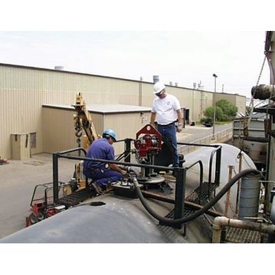 US government requirements for fire- and explosion-proof equipment has been achieved by designing the equipment according to the guidelines of the U.S. Labor Safety Department, using a hydraulic power supply and controls with no electric wiring. There is no human-operator present inside the railroad tank car during the internal washing operation.