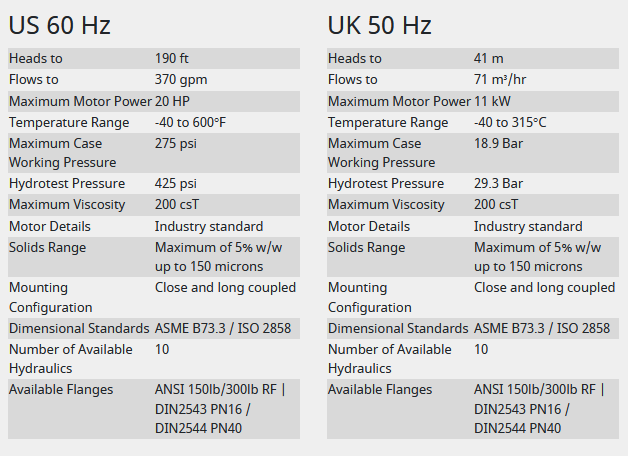 The GS (General Service) range of pumps from HMD Kontro are versatile pumps which are designed to cover a wide range of applications using minimum pump models through maximising component interchangeability. The range includes the GSA (ASME standard pump) and the GSI (ISO DIN standard pump) with a GSL option also available for temperatures down to -100°C (-150°F).
